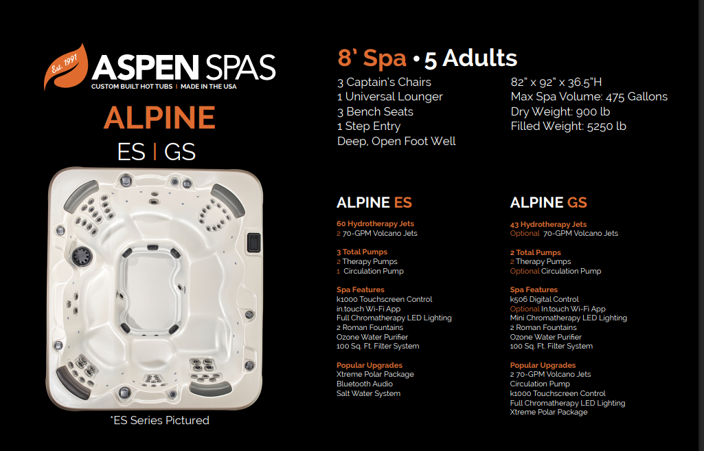 The Alpine Spa's unique size puts it in the large spa family in that it can fit seven people, but it has a smaller footprint, taking up less room on your patio. The 82″ x 92″ spa is designed with a universal lounger and three captain's chairs, each at a different height and with different jet patterns, targeting various parts of your back and shoulders. While the incredibly spacious footwell allows room for six to seven sets of feet, it's also perfect for stretching and exercising in the warmth of healing waters.
