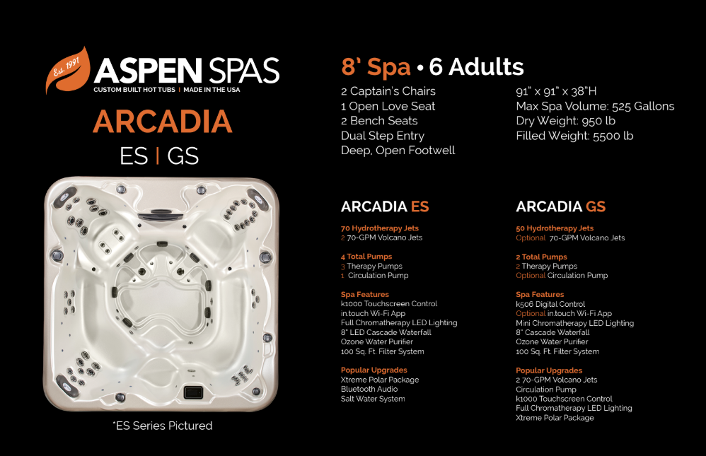 The ever-popular Arcadia spa fits seven people comfortably because of the spacious footwell, but its best features are definitely the two incredible captain's chairs. This 8′ tub offers total relaxation in every seat.