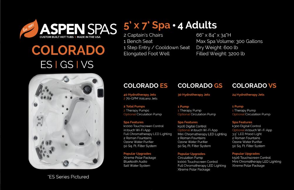 The Colorado is an exceptional spa, smaller in size, but roomy enough to socialize with your family. Originating from the 7′ Monarch Spa, the Colorado has a smaller footprint while keeping the primary focus on the 2 Captain's Chairs. The Captain's chairs are different heights/depths, and each chair has a unique jet pattern to target different parts of the back and neck, along with a foot jet for both bathers.