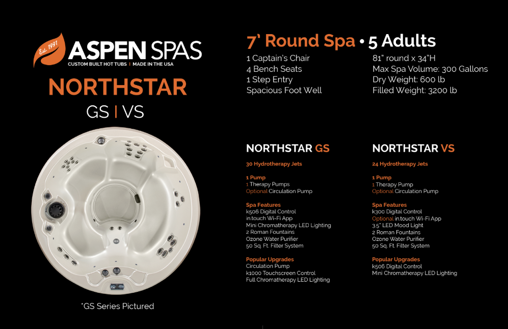 The Northstar is the ideal enhancement for your life and your yard. Its smaller size and round shape are reminiscent of the classic hot tub and will fit in seamlessly with your outdoor living space. It offers enough space for five adults and is available in the GS and VS series.
